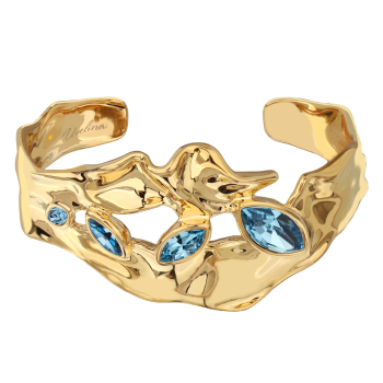 Изготовлено из ювелирного сплава на основе латуни с гальваническим покрытием золотом. Изделие украшают кристаллы SW цвета аквамарин. Ширина 3.5см.
