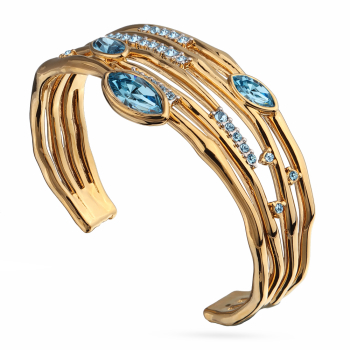 Изготовлено из ювелирного сплава на основе латуни с гальваническим покрытием золотом. Изделие украшают кристаллы SW аквамаринового цвета. Ширина 2см.
