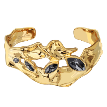 Изготовлено из ювелирного сплава на основе латуни с гальваническим покрытием золотом. Изделие украшают кристаллы SW темно-серого цвета. Ширина 3.5см.