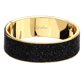 Изготовлено из ювелирного сплава на основе латуни с гальваническим покрытием золотом. Изделие украшают кристаллы SW черного цвета. Ширина браслета 2см. Пружинный механизм отвода.