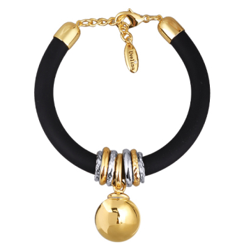 Изготовлено из ювелирного сплава на основе латуни с гальваническим покрытием золотом и родием. Изделие украшает бусина диаметром 16мм. Длина черного каучукового шнурка 19см, диаметр 8мм. Замок-карабин с удлинителем 3см.