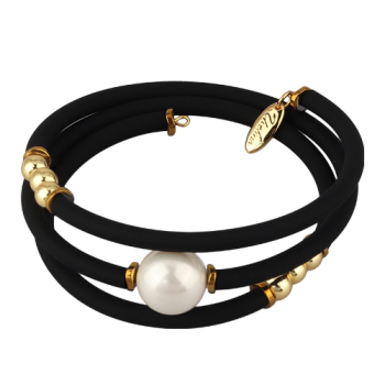 Изготовлено из ювелирного сплава на основе латуни с гальваническим покрытием золотом. Изделие украшают жемчуг Майорка белого цвета диаметром 14мм и черный каучуковый шнурок.