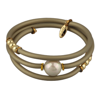 Изготовлено из ювелирного сплава на основе латуни с гальваническим покрытием золотом. Изделие украшают жемчуг Майорка цвета медовая роса диаметром 14мм и оливковый каучуковый шнурок.