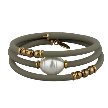 зготовлено из ювелирного сплава на основе латуни с гальваническим покрытием золотом. Изделие украшают жемчуг Майорка цвета медовая роса размером 16х18мм и оливковый каучуковый шнурок.