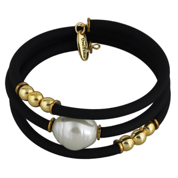 Изготовлено из ювелирного сплава на основе латуни с гальваническим покрытием золотом. Изделие украшают барочный жемчуг Майорка диаметром 16мм белого цвета и черный каучук.