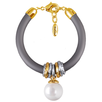 Изготовлено из ювелирного сплава на основе латуни с гальваническим покрытием золотом и родием. Изделие украшает круглый жемчуг Майорка белого цвета диаметром 16мм. Длина серого каучукового шнурка 19см, диаметр 8мм. Замок-карабин с удлинителем 3см.