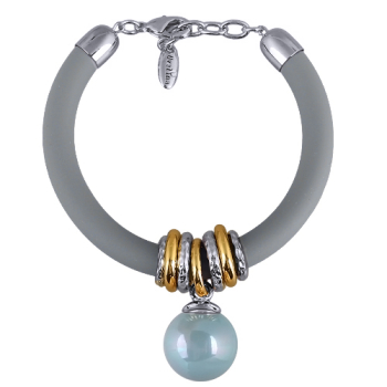 Изготовлено из ювелирного сплава на основе латуни с гальваническим покрытием родием и золотом. Изделие украшает круглый жемчуг Майорка голубого цвета диаметром 16мм. Длина серого каучукового шнурка 19см, диаметр 8мм. Замок-карабин с удлинителем 3см.