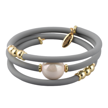 Изготовлено из ювелирного сплава на основе латуни с гальваническим покрытием золотом. Изделие украшают жемчуг Майорка розового цвета диаметром 16мм и серый каучуковый шнурок.