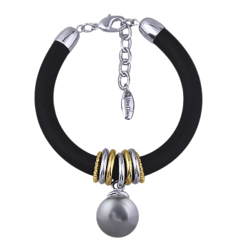 Изготовлено из ювелирного сплава на основе латуни с гальваническим покрытием родием и золотом. Изделие украшает круглый жемчуг Майорка серо-голубого цвета диаметром 16мм. Длина черного каучукового шнурка 19см, диаметр 8мм. Замок-карабин с удлинителем 3см.