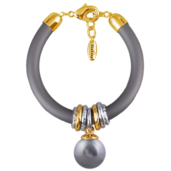 Изготовлено из ювелирного сплава на основе латуни с гальваническим покрытием золотом и родием. Изделие украшает круглый жемчуг Майорка серо-голубого цвета диаметром 16мм. Длина серого каучукового шнурка 19см, диаметр 8мм. Замок-карабин с удлинителем 3см.