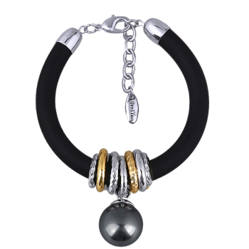 Изготовлено из ювелирного сплава на основе латуни с гальваническим покрытием родием и золотом. Изделие украшает круглый жемчуг Майорка темно-серого цвета диаметром 16мм. Длина черного каучукового шнурка 19см, диаметр 8мм. Замок-карабин с удлинителем 3см.