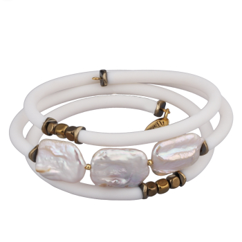 Изготовлено из ювелирного сплава на основе латуни с гальваническим покрытием золотом. Изделие украшают жемчуг белого цвета и белый каучуковый шнурок.