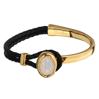 Изготовлено из ювелирного сплава на основе латуни с гальваническим покрытием золотом. Изделие украшают кристаллы SW цвета белый опал и черная кожа. Размер украшения 17х13мм. Длина браслета 17см.