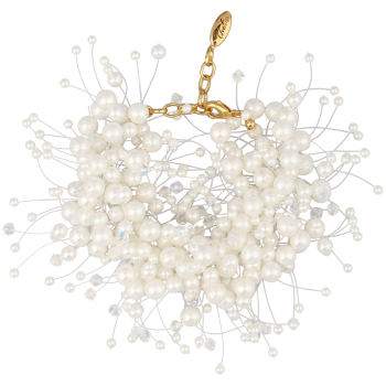 Изготовлено из ювелирного сплава на основе латуни с гальваническим покрытием золотом. Изделие украшают белые жемчуг Майорка диаметром 3-7мм и кристаллы SW размером 7х7мм. Длина 17см. Замок-карабин с удлинителем 5см.