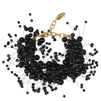 Изготовлено из ювелирного сплава на основе латуни с гальваническим покрытием золотом. Изделие украшают черные жемчуг Майорка диаметром 3-7мм и кристаллы SW размером 7х7мм. Длина 17см. Замок-карабин с удлинителем 5см.