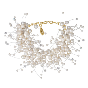 Изготовлено из ювелирного сплава на основе латуни с гальваническим покрытием золотом. Изделие украшают белый жемчуг диаметром 3-7мм и кристаллы SW белого хамелеон цвета размером 7х7мм. Длина 17см. Замок-карабин с удлинителем 5см.