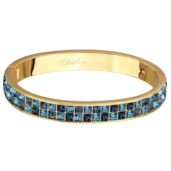 Изготовлено из ювелирного сплава на основе латуни с гальваническим покрытием золотом. Изделие украшают кристаллы SW джинс и аквамарин цвета. Пружинный механизм отвода. Ширина браслета 0, 8см.