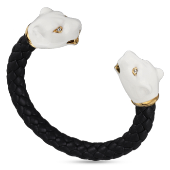 Изготовлено из ювелирного сплава на основе латуни с гальваническим покрытием золотом. Изделие украшают кристаллы SW и эмаль белого цвета. Длина браслета на черном кожаном шнурке 17см.