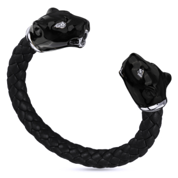 Изготовлено из ювелирного сплава на основе латуни с гальваническим покрытием родием. Изделие украшают черная эмаль и кристаллы SW белого цвета. Длина браслета на черном кожаном шнурке 17см.