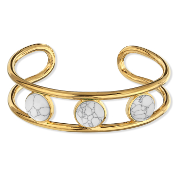 Изготовлено из ювелирного сплава на основе латуни с гальваническим покрытием золотом. Изделие украшает белая бирюза. Ширина браслета 1, 8см.