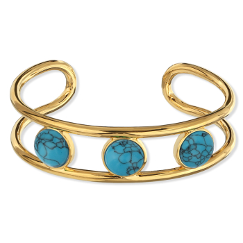 Изготовлено из ювелирного сплава на основе латуни с гальваническим покрытием золотом. Изделие украшает бирюза. Ширина браслета 1, 8см.