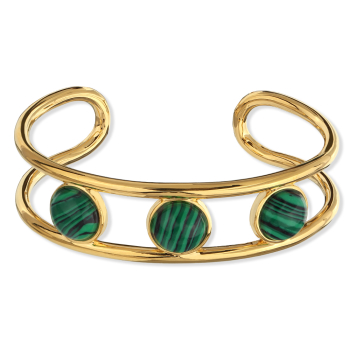 Изготовлено из ювелирного сплава на основе латуни с гальваническим покрытием золотом. Изделие украшает малахит. Ширина браслета 1.8см.