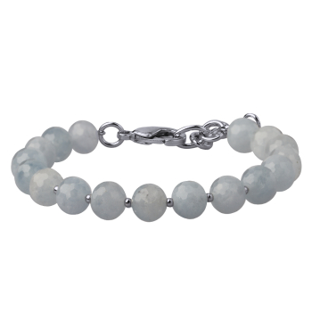 Изготовлено из ювелирного сплава на основе латуни с гальваническим покрытием родием. Изделие украшает аквамарин диаметром 8мм. Длина 17см. Замок-карабин с удлинителем 5см.