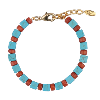 Изготовлено из ювелирного сплава на основе латуни с гальваническим покрытием золотом. Изделие украшает натуральные бирюза диаметром 6мм и корал диаметром 3мм. Длина 18см. Замок-карабин с удлинителем 3см.