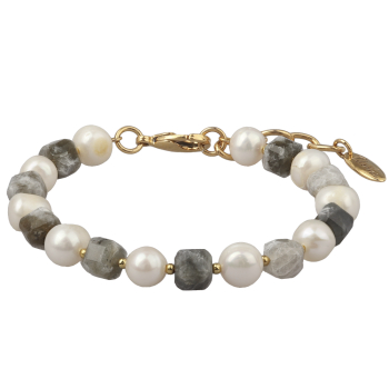 Изготовлено из ювелирного сплава на основе латуни с гальваническим покрытием золотом. Изделие украшает спектролит и натуральный жемчуг белого цвета. Длина 17см. Замок-карабин с удлинителем 3см.