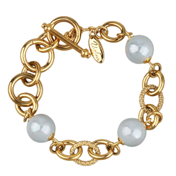 Изготовлено из ювелирного сплава на основе латуни с гальваническим покрытием золотом. Изделие украшает майорский круглый жемчуг голубого цвета диаметром 12мм. Длина браслета 18см. Застёжка в форме якоря с удлинителем 3см.