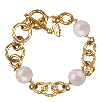 Изготовлено из ювелирного сплава на основе латуни с гальваническим покрытием золотом. Изделие украшает майорский круглый жемчуг розового цвета диаметром 12мм. Длина браслета 18см. Застёжка в форме якоря с удлинителем 3см.