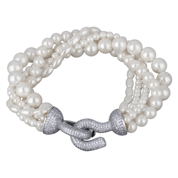 Изготовлено из ювелирного сплава на основе латуни с гальваническим покрытием родием. Изделие украшают жемчуг Майорка диаметром 4-6мм и белый фианит Длина 20см.