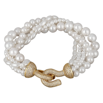 Изготовлено из ювелирного сплава на основе латуни с гальваническим покрытием золотом. Изделие украшают жемчуг Майорка диаметром 4-6мм и белый фианит. Длина 20см.