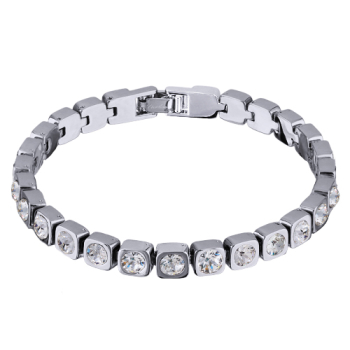 Изготовлено из ювелирного сплава на основе латуни с гальваническим покрытием родием. Изделие украшают кристаллы SW белого цвета диаметром 4мм. Длина 17-19см.