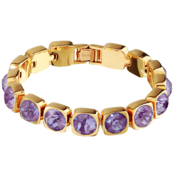 Изготовлено из ювелирного сплава на основе латуни с гальваническим покрытием золотом. Изделие украшают кристаллы SW пурпурного цвета диаметром 8мм. Длина 17-19см.