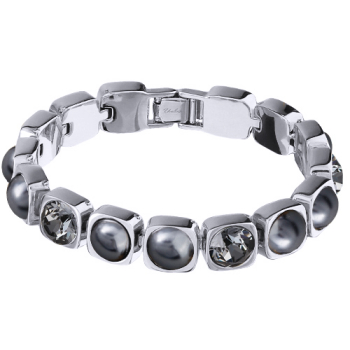 Изготовлено из ювелирного сплава на основе латуни с гальваническим покрытием родием. Изделие украшают кристаллы SW и жемчуг Майорка темно-серого цвета диаметром 8мм. Длина 17-19см.
