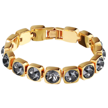 Изготовлено из ювелирного сплава на основе латуни с гальваническим покрытием золотом. Изделие украшают кристаллы SW темно-серого цвета диаметром 8мм. Длина 17-19см.