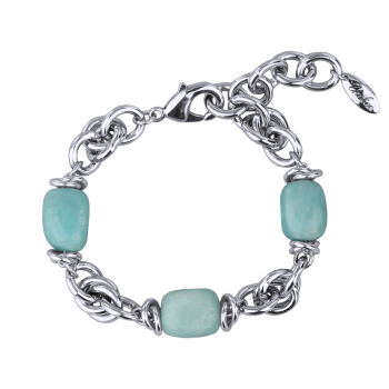 Изготовлено из ювелирного сплава на основе латуни с гальваническим покрытием родием. Изделие украшает амазонит 12-13мм. Длина 17см. Замок-карабин с удлинителем 5см.