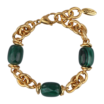 Изготовлено из ювелирного сплава на основе латуни с гальваническим покрытием золотом. Изделие украшает малахит 12х16мм. Длина 17см. Замок-карабин с удлинителем 4см.