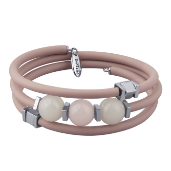 Изготовлено из ювелирного сплава на основе латуни с гальваническим покрытием родием. Изделие украшает розовый кварц диаметром 12-16мм и розовый каучуковый шнурок.