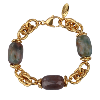 Изготовлено из ювелирного сплава на основе латуни с гальваническим покрытием золотом. Изделие украшает яшма 13х18мм. Длина 17см. Замок-карабин с удлинителем 2см.