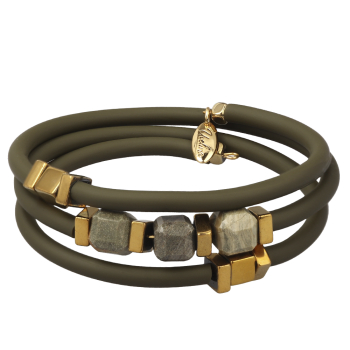 Изготовлено из ювелирного сплава на основе латуни с гальваническим покрытием родием. Изделие украшают натуральная яшма и оливковый каучуковый шнурок.