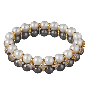 Изготовлено из ювелирного сплава на основе латуни с гальваническим покрытием золотом. Изделие украшают жемчуг Майорка диаметром 7мм белого и темно-серого цвета и белые фианит. Браслет на резинке.
