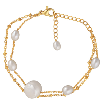 Изготовлено из ювелирного сплава на основе латуни с гальваническим покрытием золотом. Изделие украшает жемчуг диаметром 7-11мм белого цвета. Длина 16см. Замок-карабин с удлинителем 4см.