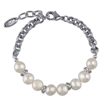 Изготовлено из ювелирного сплава на основе латуни с гальваническим покрытием родием. Изделие украшает белый жемчуг диаметром 6мм. Длина 18см. Замок-карабин с удлинителем 3см. *Цвет и форма жемчужин может отличаться от изображенной на фото.