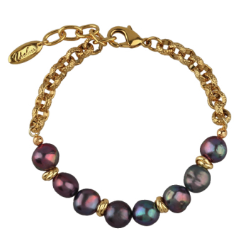 Изготовлено из ювелирного сплава на основе латуни с гальваническим покрытием золотом. Изделие украшает бензиновый жемчуг диаметром 6мм. Длина 18см. Замок-карабин с удлинителем 3см. *Цвет и форма жемчужин может отличаться от изображенной на фото.
