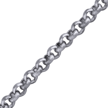 Изготовлено из ювелирного сплава на основе латуни с гальваническим покрытием палладием. Круглое рифленое плетение диаметром 9, 3мм. Длина 21см. Замок-карабин с удлинителем 2см.