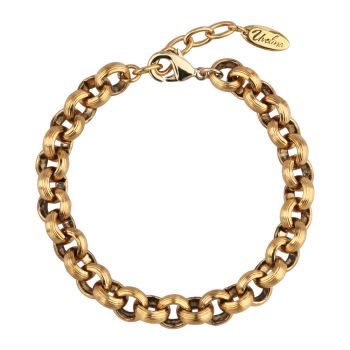 Изготовлено из ювелирного сплава на основе латуни с гальваническим покрытием античным золотом. Круглое рифленое плетение диаметром 9, 3мм. Длина 21см. Замок-карабин с удлинителем 2см.