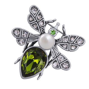 Изготовлено из ювелирного сплава на основе латуни с гальваническим покрытием античным серебром. Изделие украшают кристаллы SW зеленого цвета и белый майорский жемчуг диаметром 8мм. Размер украшения 4х4см. Застежка-булавка.