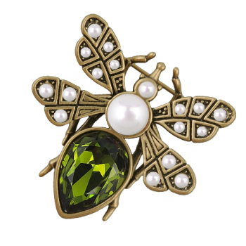 Изготовлено из ювелирного сплава на основе латуни с гальваническим покрытием бронзой. Изделие украшают кристаллы SW зеленого цвета и белый майорский жемчуг диаметром 8мм. Размер украшения 4х4см. Застежка-булавка.